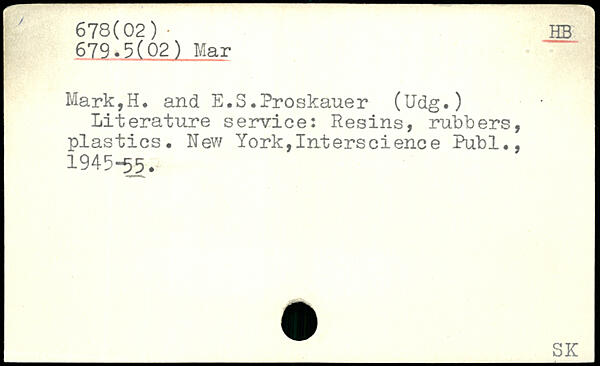 Mark,H. and E.3.Proskauer (Udg.) Literature service: Resins, rubbers, plastics.