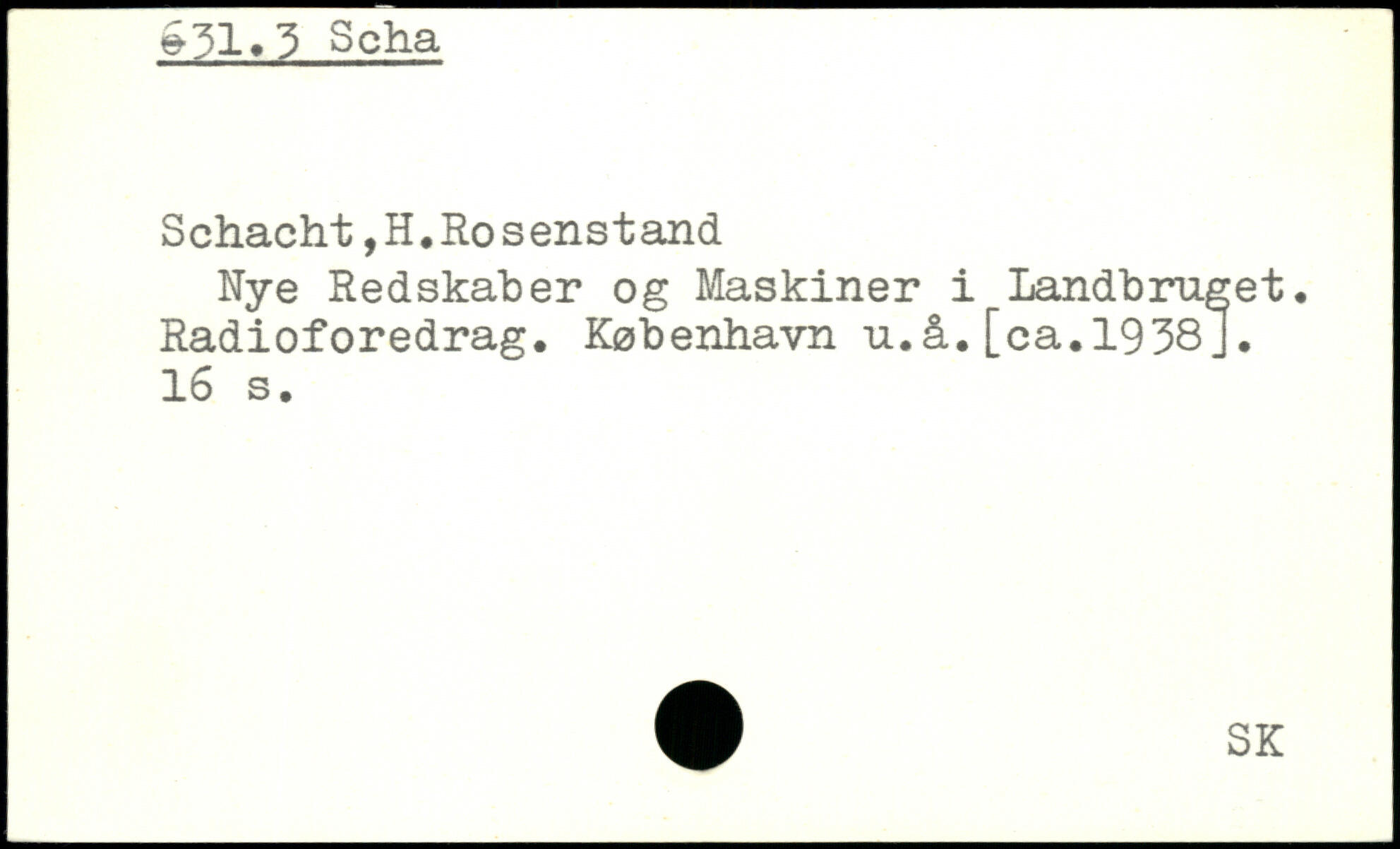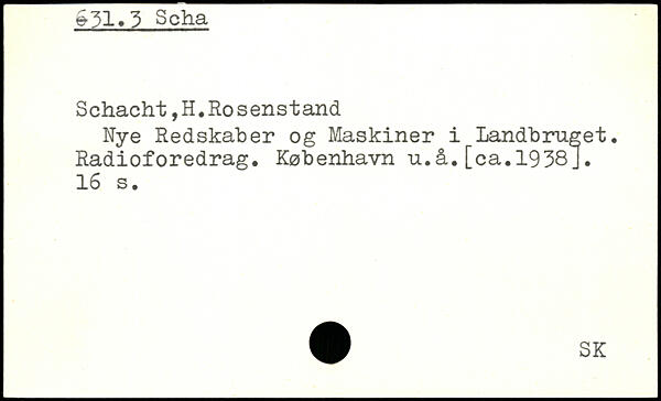 Schacht ,H. Ro senstand Nye Redskaber og Maskiner i Landbruget. Radioforedrag. København u.å.[ca.1938J.