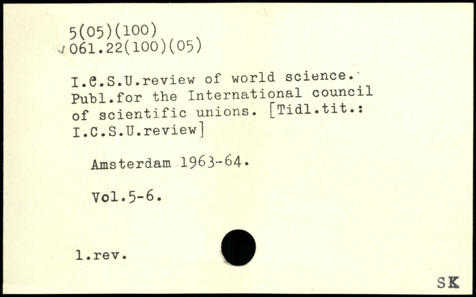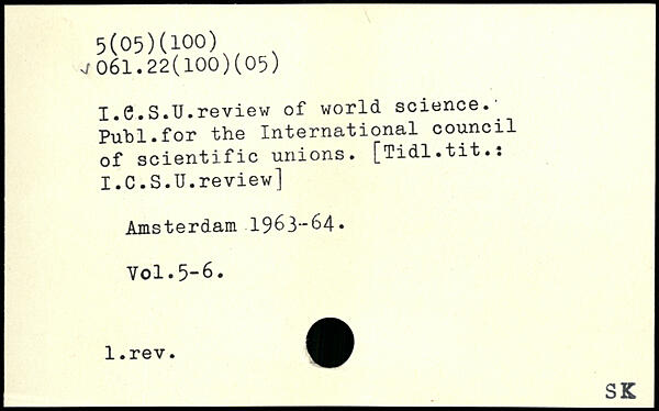 I.0.S.U.review of world science. Publ.for the International council of scientific unions. [Tidl.tit.s I.C.S.U.review] Amsterdam 1963--64.