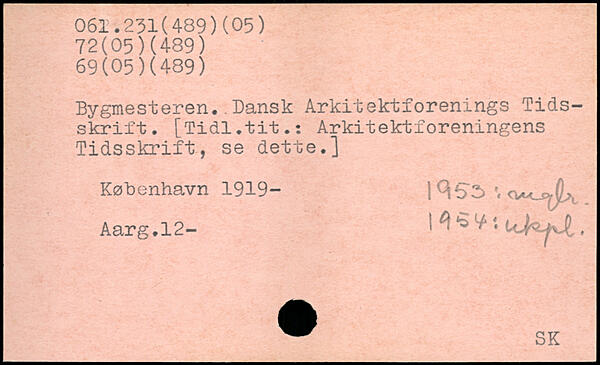 Bygmesteren..Dansk Arkitektforenings Tidsskrift. [Tidl.tit.: Arkitektforeningens Tidsskrift, se dette.]