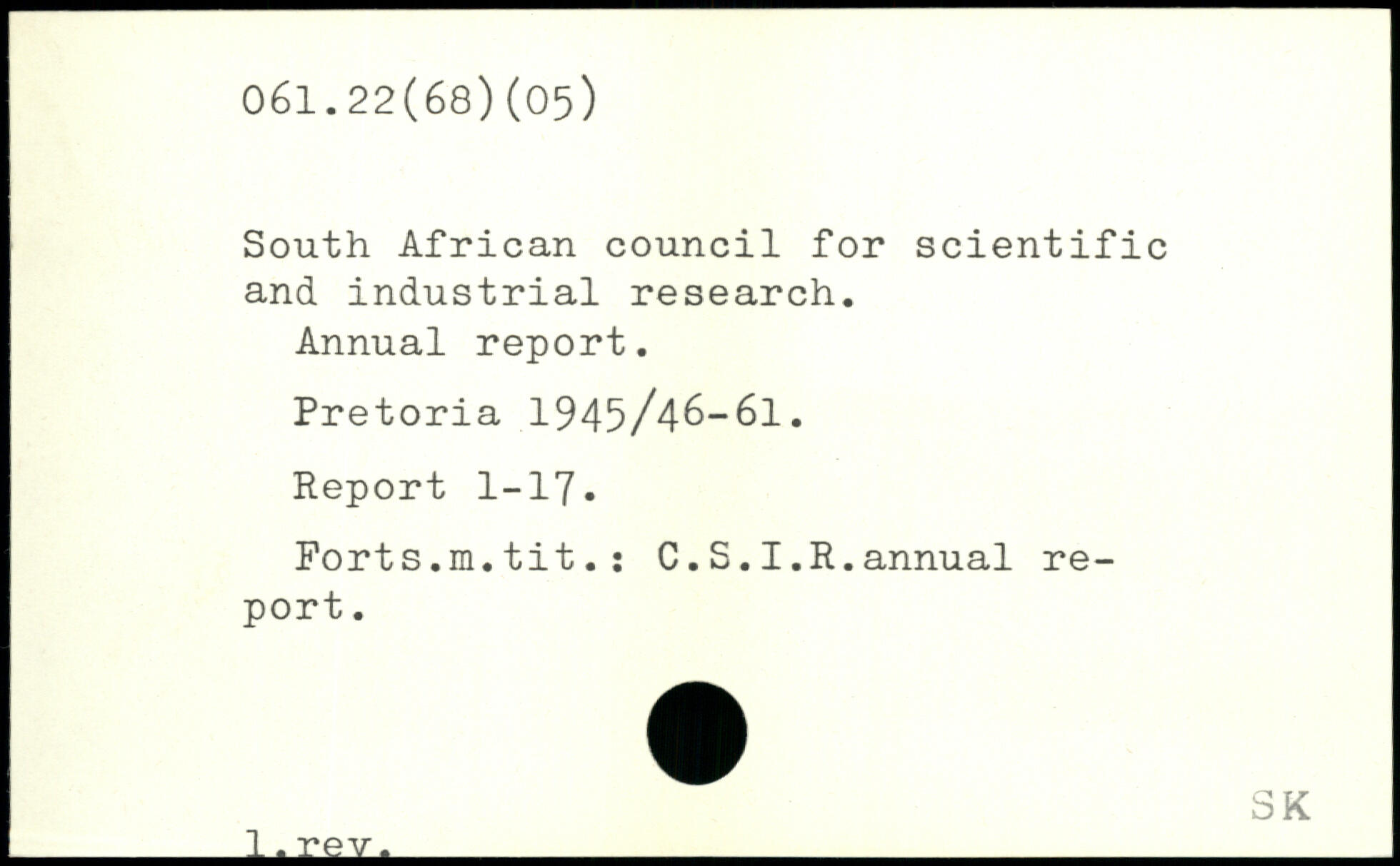 South African council for scientific and industrial research. Annual report. Pretoria 1945/46-61. Report 1-17. Forts.m.tit.: C.S.I.R.annual report. SK _1-^ev._
