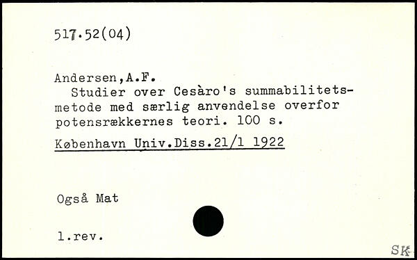 Studier over Cesåro's summabilitets-metode med særlig anvendelse overfor potensrækkernes teori. ICO s. København Univ.Diss.2l/l 1922 Også Mat