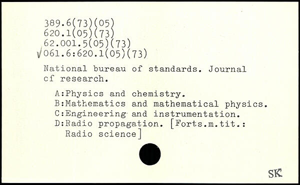 National bureau of standards. Journal cf research. A:Physics and chemistry. BiMathematics and mathematical physics. C: Engineering and instrumentation. D:Radio propagation. [Forts.m.tit.: Radio science]