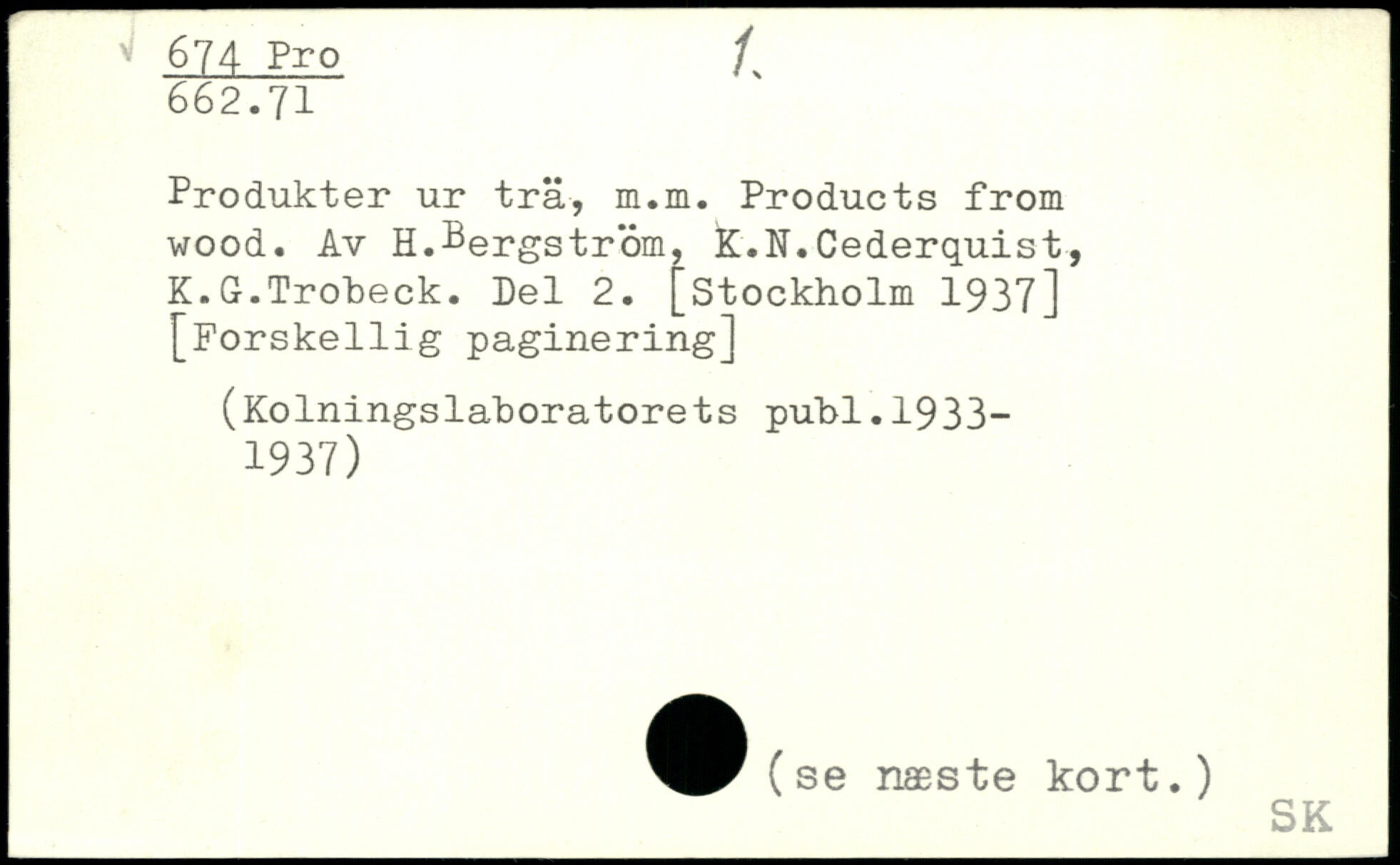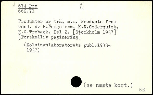 Produkter ur trä, m.m. Products from wood. Av H.Bergstrom, K.N.Cederquist, K.G.Trobeck. Del 2.