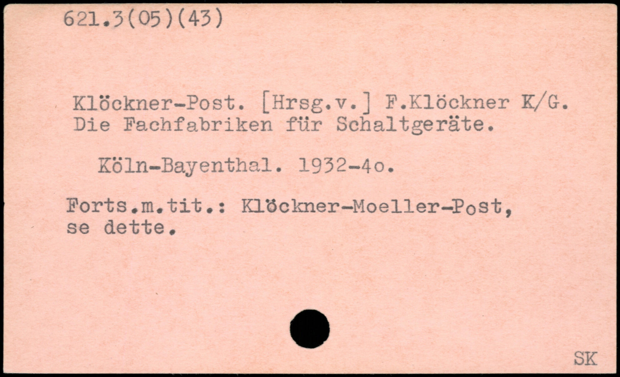 Klöckner-Post. [Hrsg.v.] F.Klöckner K/G. Die Fachfabriken für Sehaltgeräte. Köln-Bayenthal. 1932-4o. Forts.m.tit.: Kl'öckner-Moeller-Post, se dette.