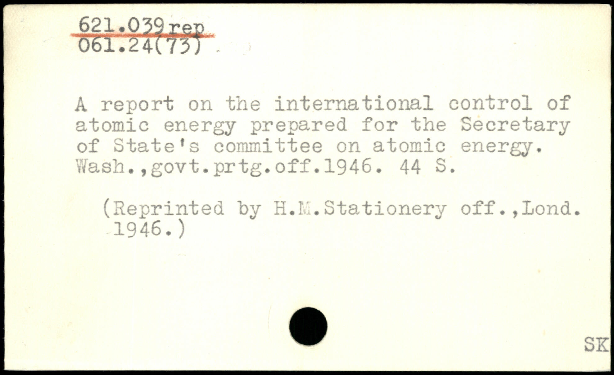 A report on the international control of atomic energy prepared for the Secretary of State’s committee on atomic energy. Wash,,govt.prtg.off.1946.