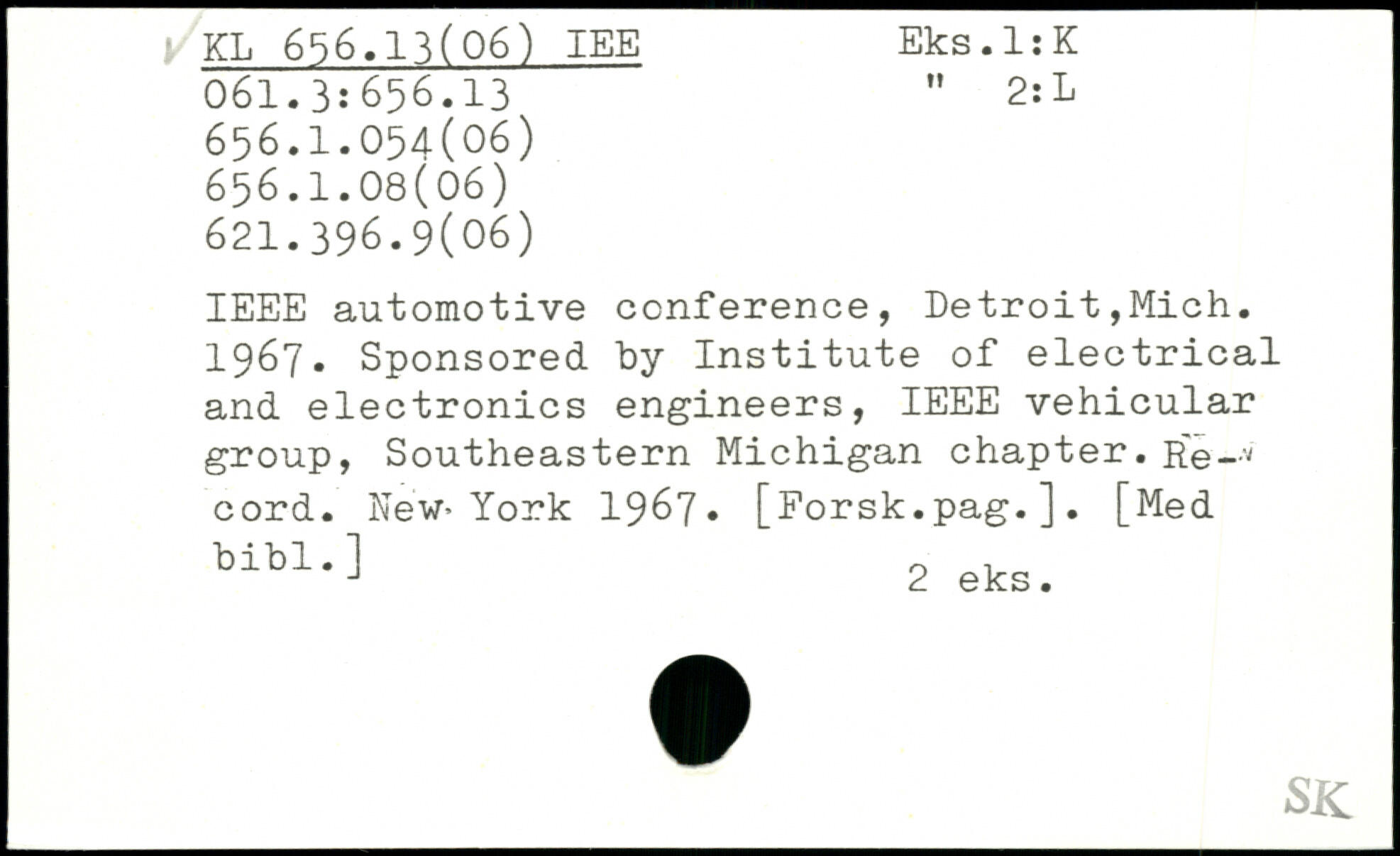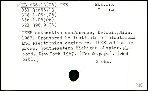 IEEE automotive conference, Detroit,Mich. 1967. Sponsored by Institute of electrical and electronics engineers, IEEE vehicular group, Southeastern Michigan chapter. Re —v cord. New-York 1967, [Forsk.pag.]. [Med bib1-] 2 eks.