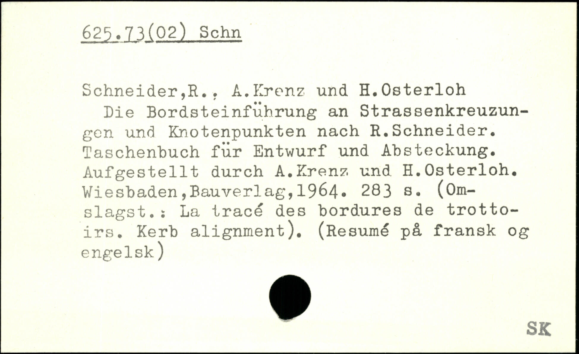 Die Bordsteinfuhrung an Strassenkreuzun-gen und Knotenpunkten nach R.Schneider. Taschenbuch für Entwurf und Absteckung. Aufgestellt durch A.Krenz und H.Osterloh.