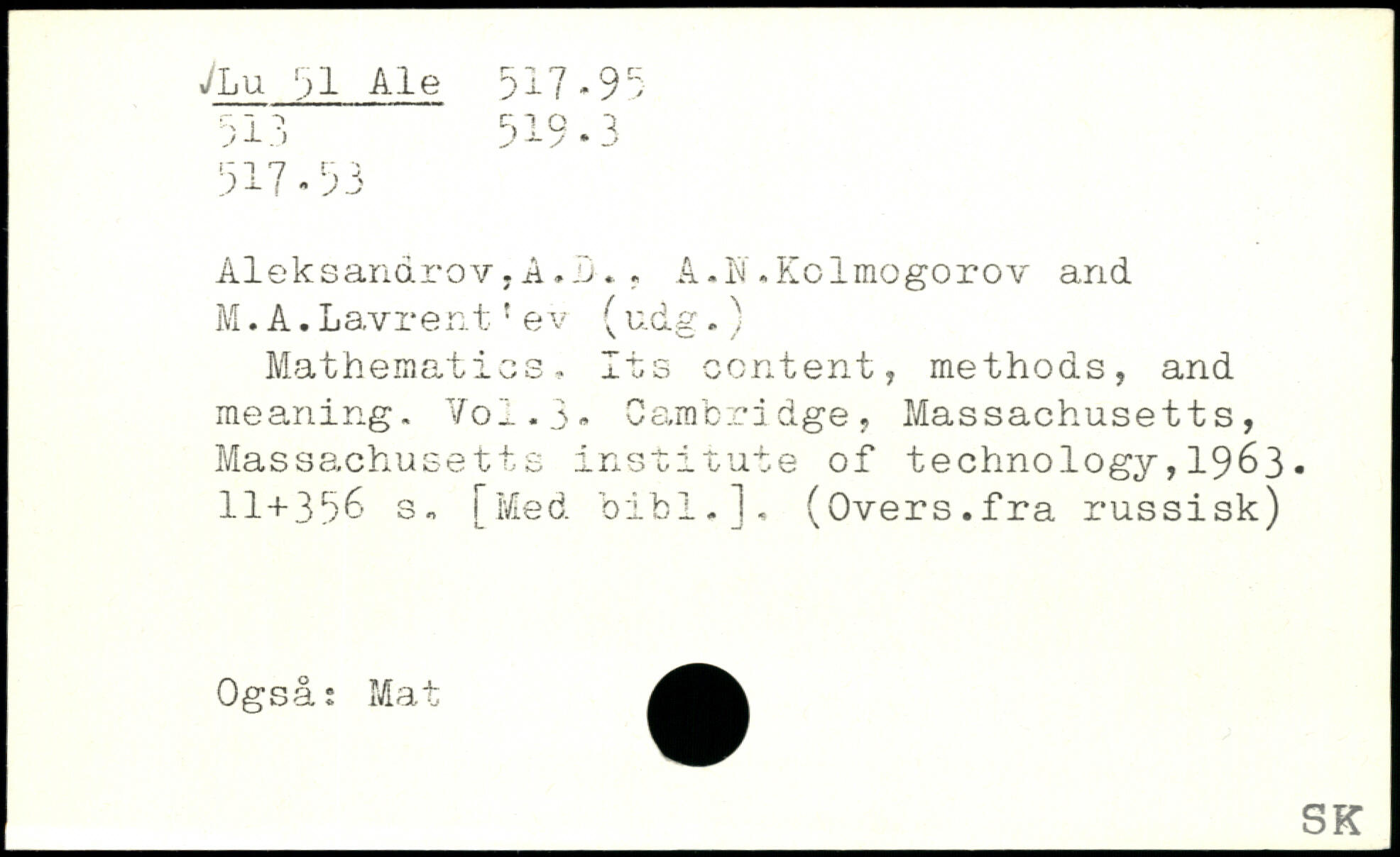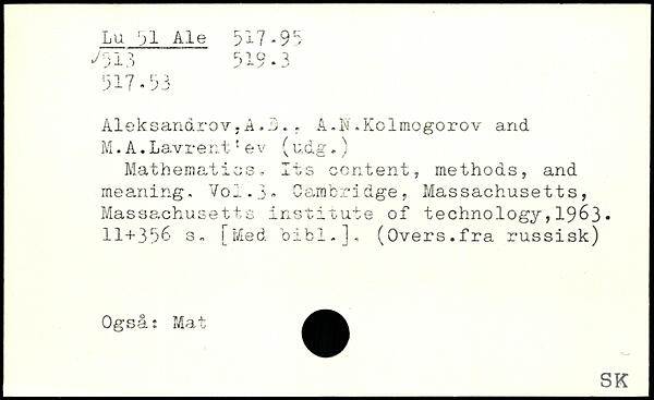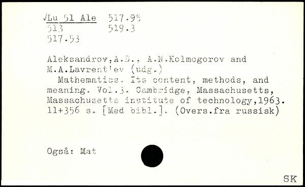 Aleksandrov,A.3., A.N.Kolmogorov and M.A.Lavrent'ev (udg.) Mathematics. Its content, methods, and meaning. Vo1.3.