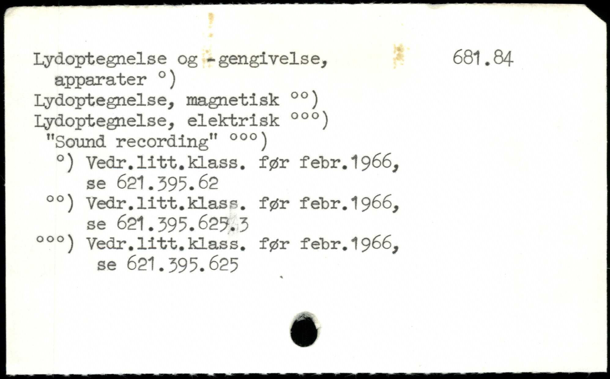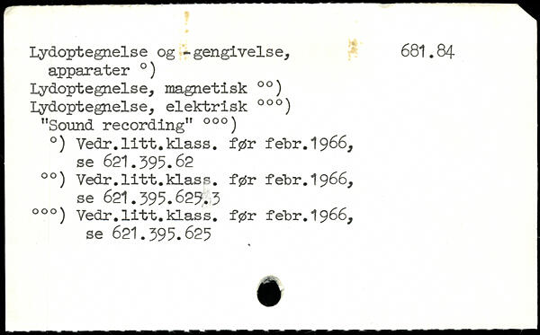 lydoptegnelse og -gengivelse, 681.84 apparater .) Lydoptegnelse, magnetisk 00) lydoptegnelse, elektrisk 00.) "Sound recording" 000) .) Vedr.litt.klass, før febr. 1966, se 621.395.62 00) Vedr.litt.klass, før febr.1966, se 62I.395.629.3 000) Vedr.litt.klass, før febr.1966, se 62l.395.625