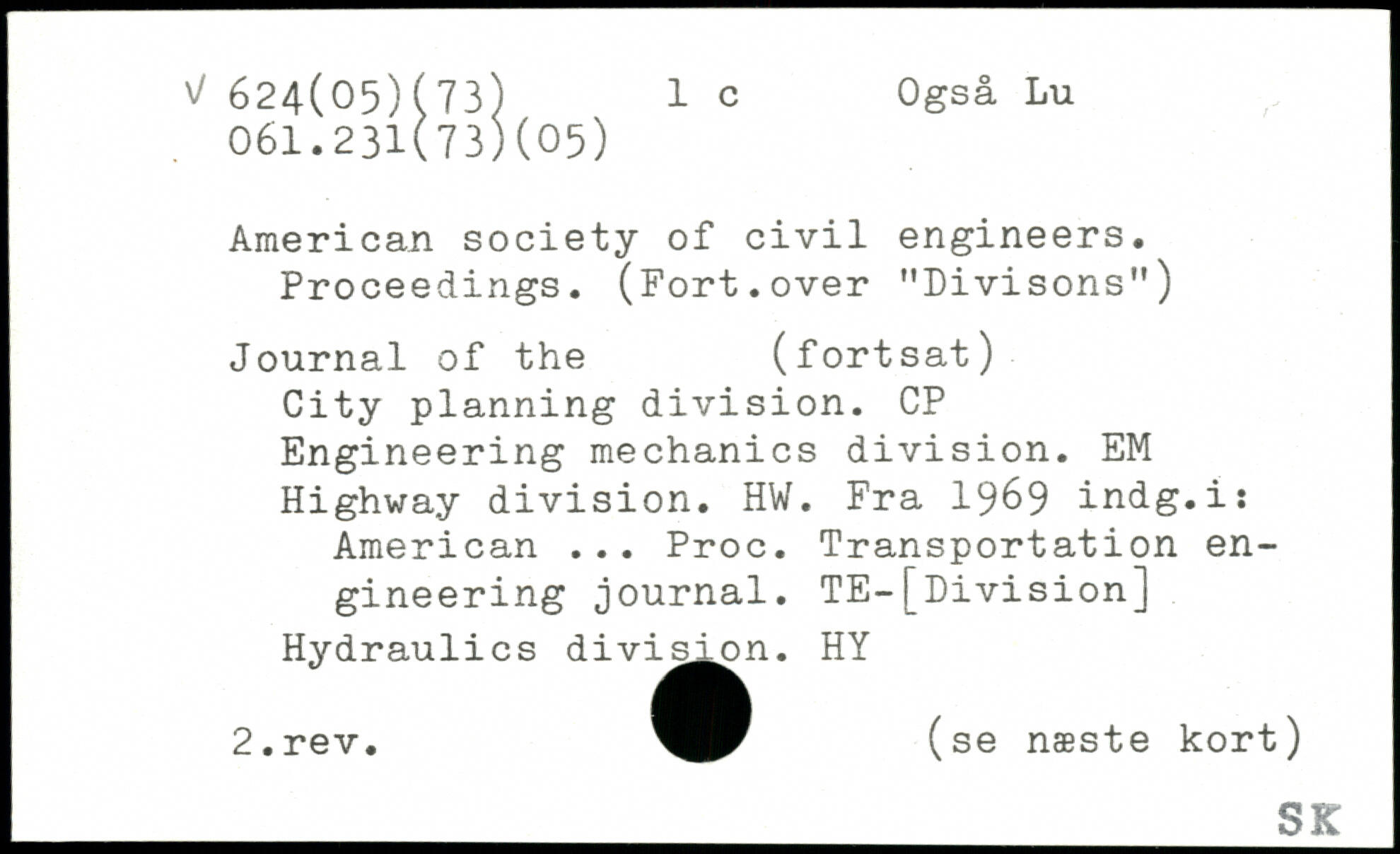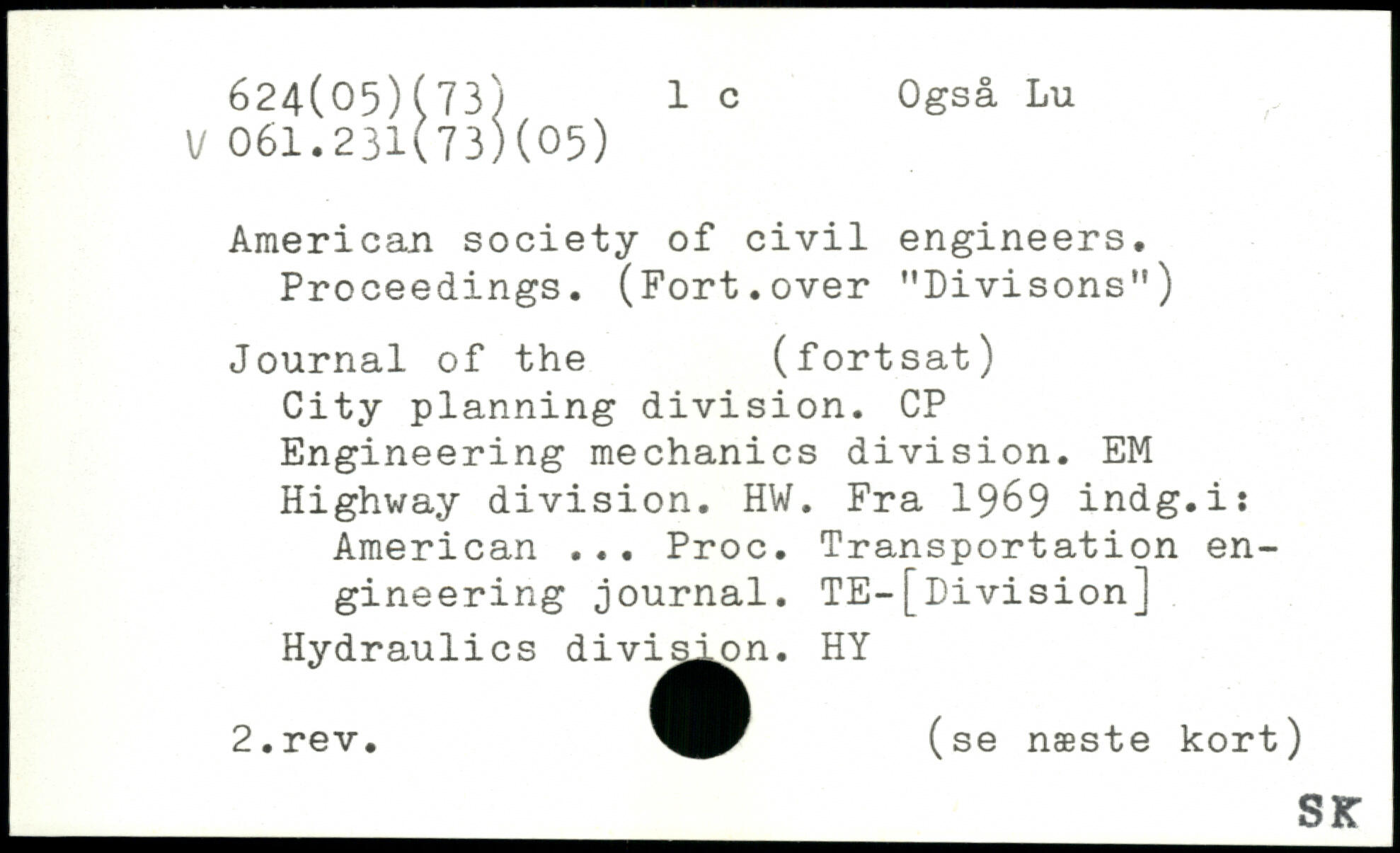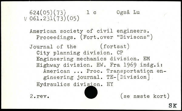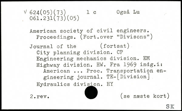 American society of civil engineers. Proceedings. (Fort.over "Divisons") Journal of the (fortsat) City planning division. CP Engineering mechanics division. EM Highway division. HW. Fra 1969 indg.i: American ... Proc. Transportation engineering journal. TE-[Division] Hydraulics divis^n. HY