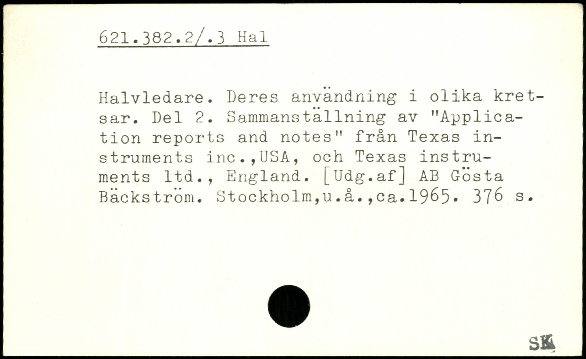 Halvledare. Deres användning i olika kretsar. Del 2. Sammanställning av "Application reports and notes" från Texas instruments inc.,USA, och Texas instruments ltd., England. [Udg.af] AB Gösta Backström. Stockholm,u.å.,ca.1965
