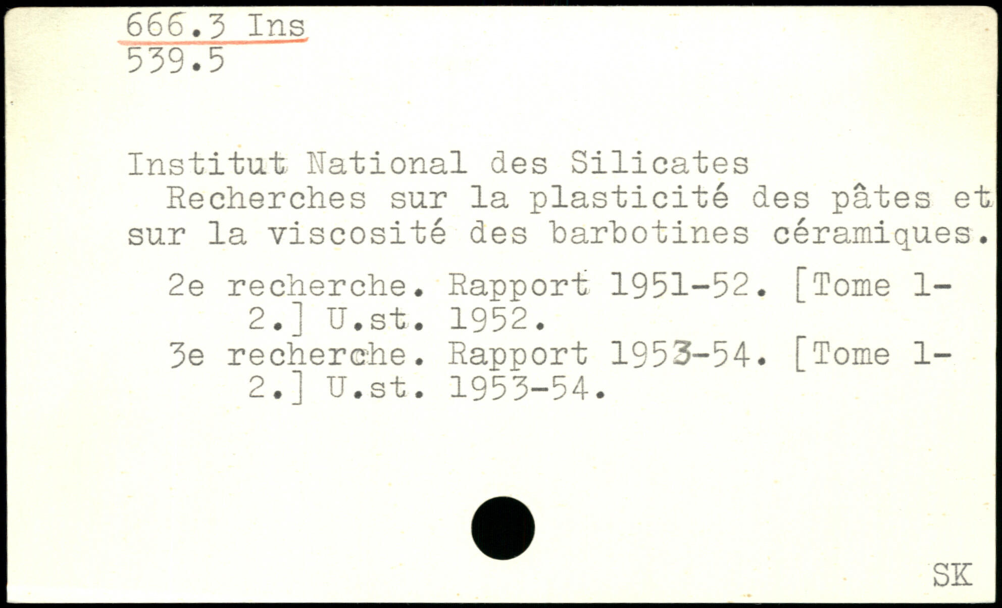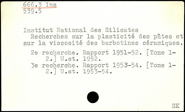 Institut National des Silicates Recherches sur la plasticité des pâtes et sur la viscosité des barbotines céramiques. 2e recherche. Rapport 1951-52. [Tome 1-2.] U.st. 1952. 3e recherche. Rapport 1953-54. [Tome 1-2.] U.st. 1953-54.