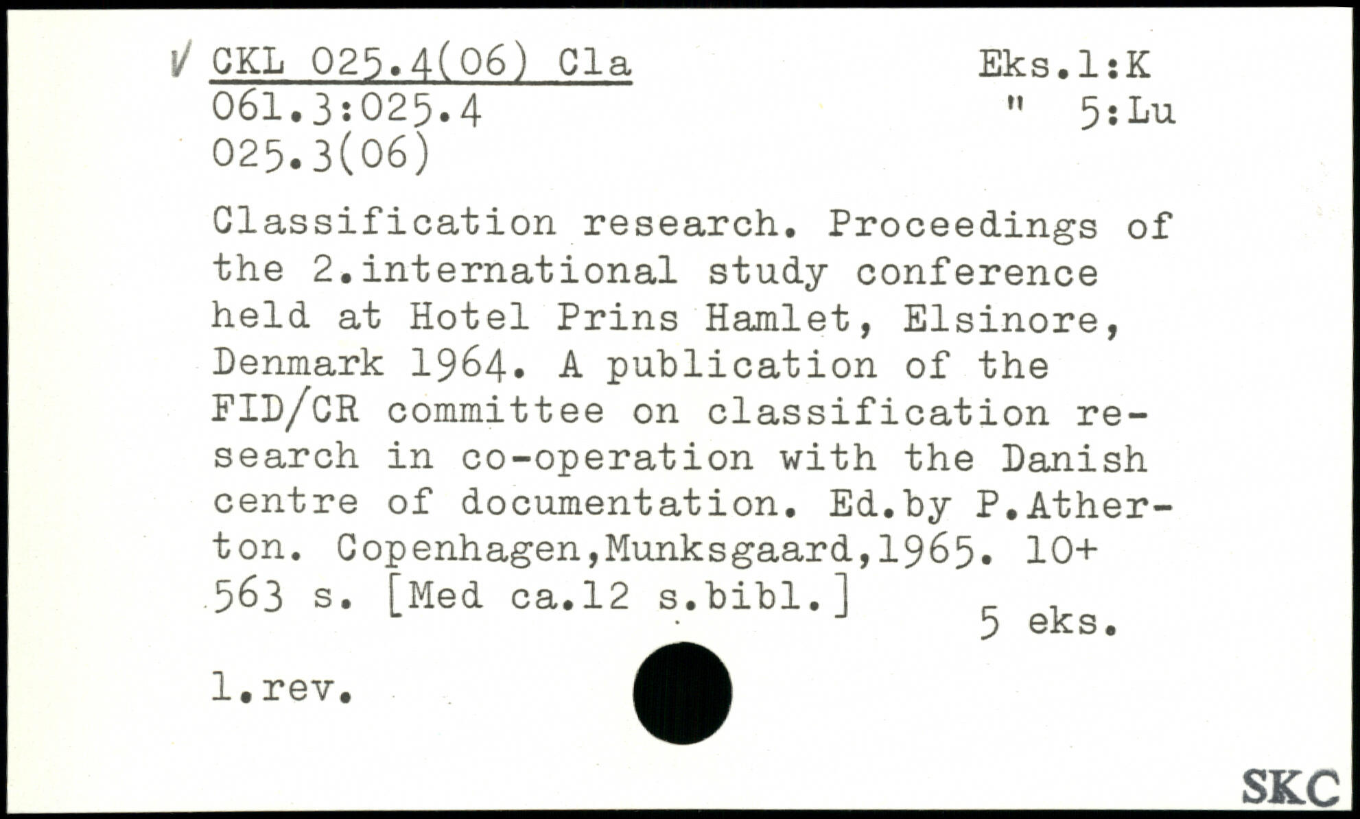 Glassification research. Proceedings of the 2.international study conference held at Hotel Prins Hamlet, Elsinore, Denmark 1964, A publication of the FID/CR committee on classification research in co-operation with the Danish centre of documentation. Ed.by P.Atherton.