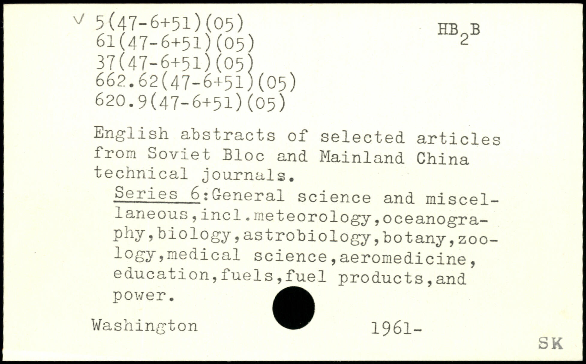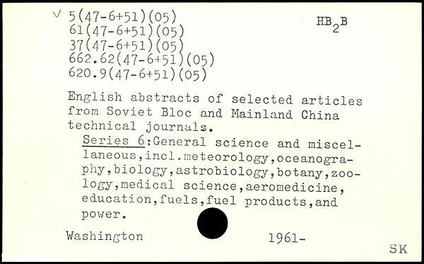 English abstracts of selected articles from Soviet Bloc and Mainland China technical journals. Series_6:General science and miscel-1aneous,inc1.meteorology,oceanography ,biology,astrobiology,botany,zoo-logy,medical science,aeromedicine, education,fuels,fuel products,and power.