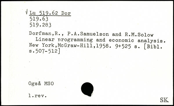 Dorfman,R., P.A.Samuelson and R.M.Solow Linear nrogramming and economic analysis.