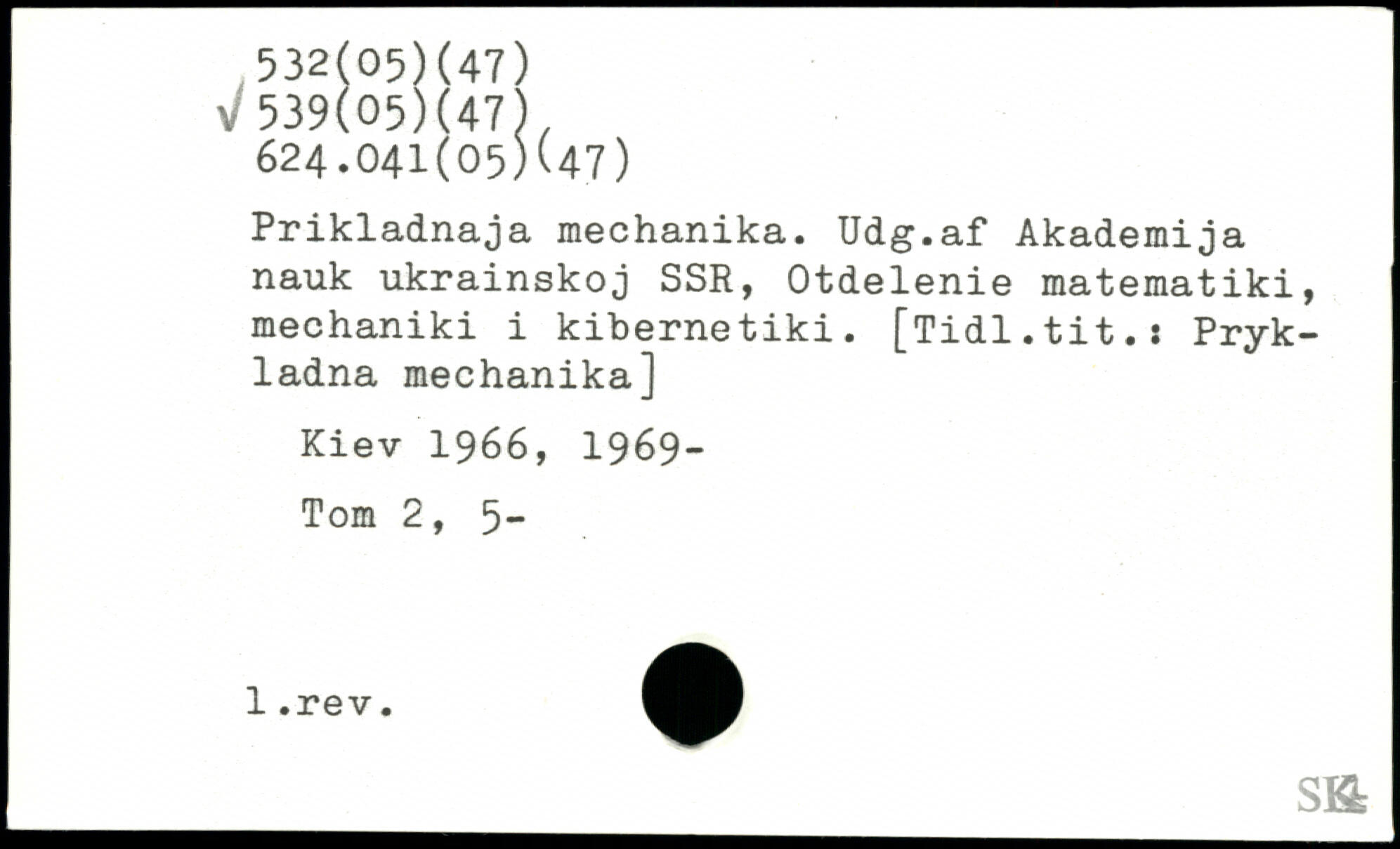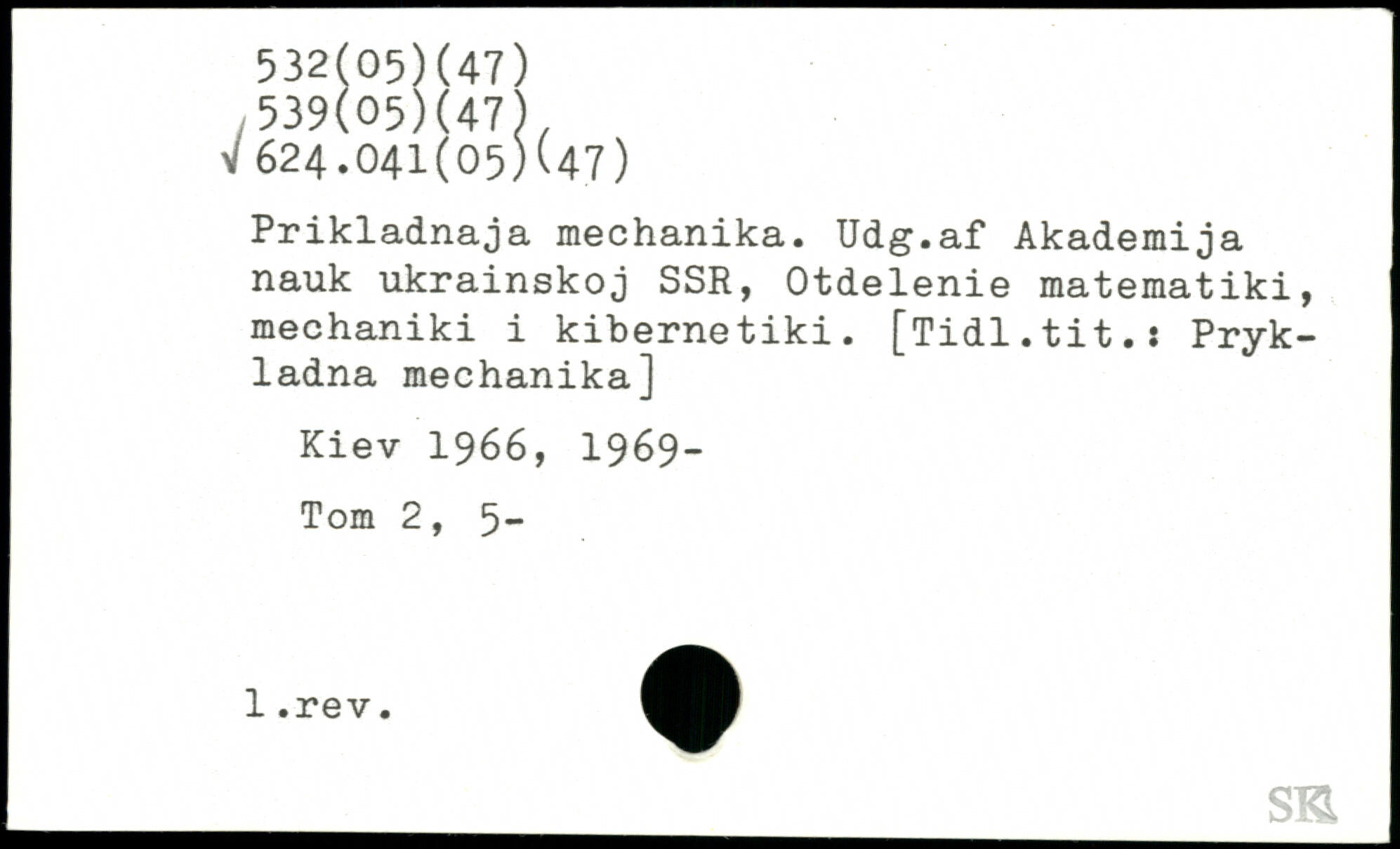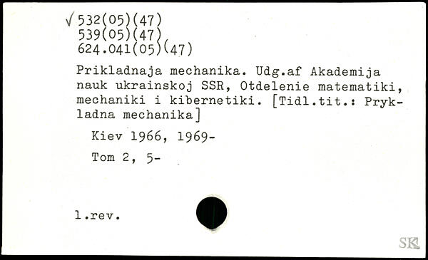 Prikladnaja mechanika. Udg.af Akademija nauk ukrainskoj SSR, Otdelenie matematiki, mechaniki i kibernetiki. [Tidl.tit.: Pryk-ladna mechanika] Kiev 1966, 1969- Tom 2, 5-