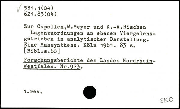Zur Capellen,W.Meyer und K.-A.Rischen Lagenzuordnungen an ebenen Viergelenkgetrieben in analytischer Darstellung. Eine Massynthese.