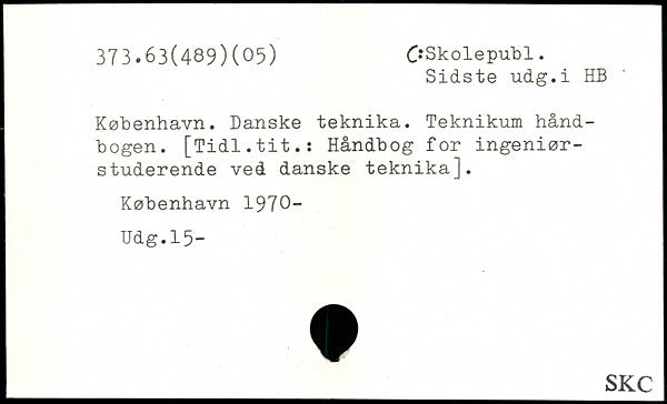 Sidste udg.i HB København. Danske teknika. Teknikum håndbogen. [Tidl.tit.: Håndbog for ingeniørstuderende ved danske teknika].