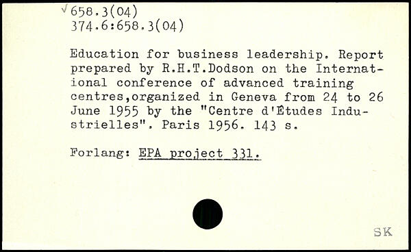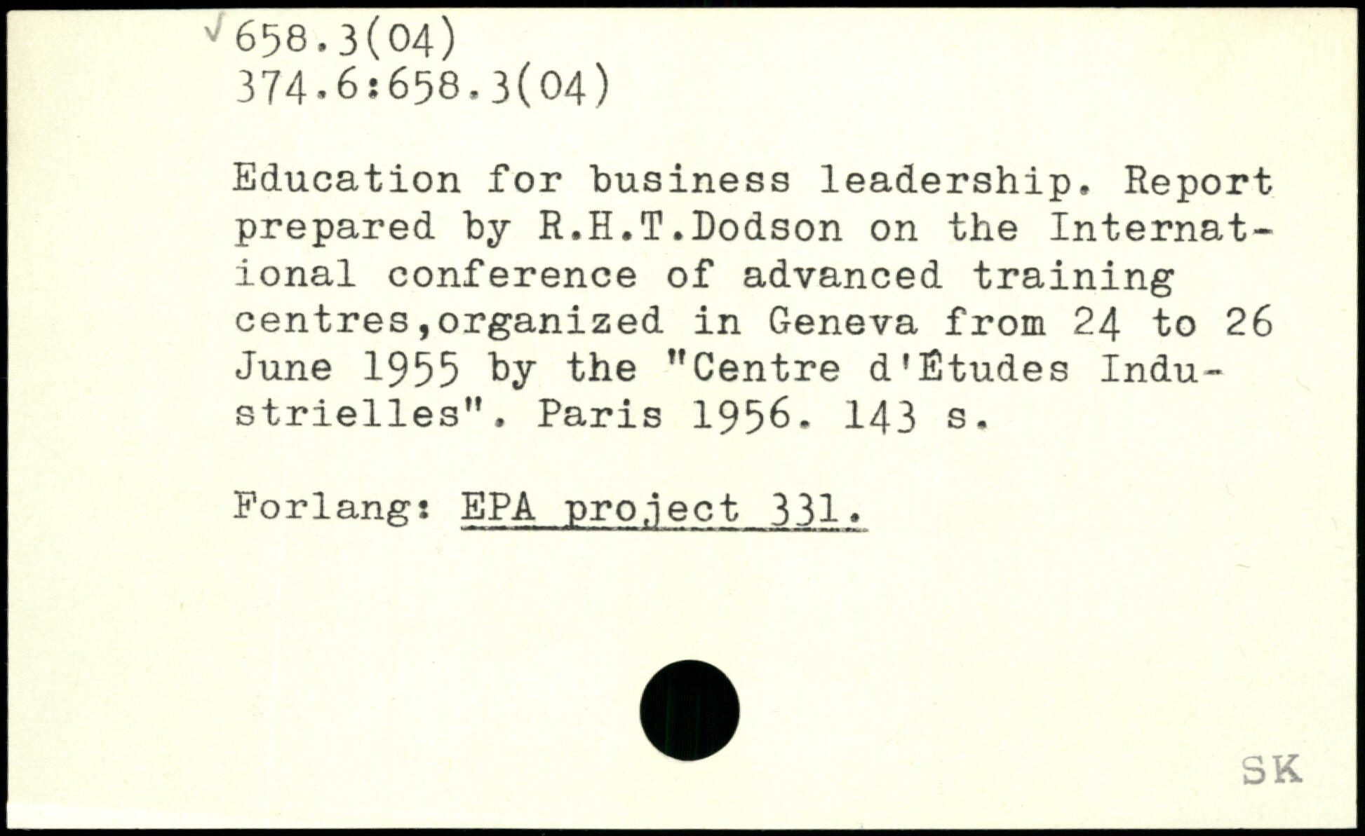 Education for business leadership. Report prepared by R.H.T.Dodson on the International conference of advanced training centres,organized in Geneva from 24 to 26 June 1955 ty the "Centre d'Etudes Indu-strielles".
