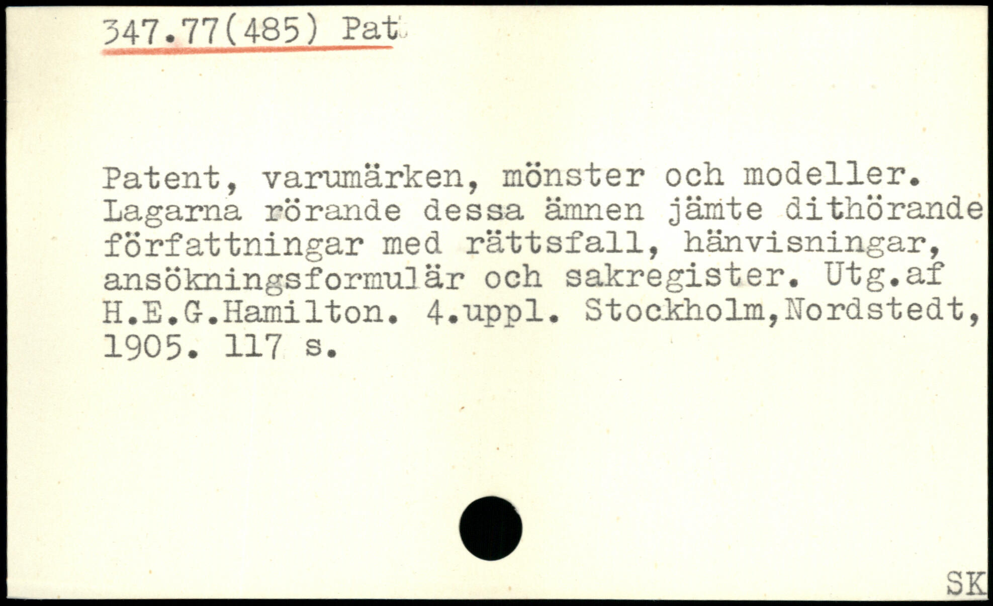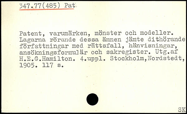 Patent, varumärken, mönster och modeller. Lagarna rörande dessa ämnen jämte dithörande författningar med rättsfall, hänvisningar, ansökningsformul! är och sakregister. Ut g. af H.E.Gr.Hamilton. 4.npnl.