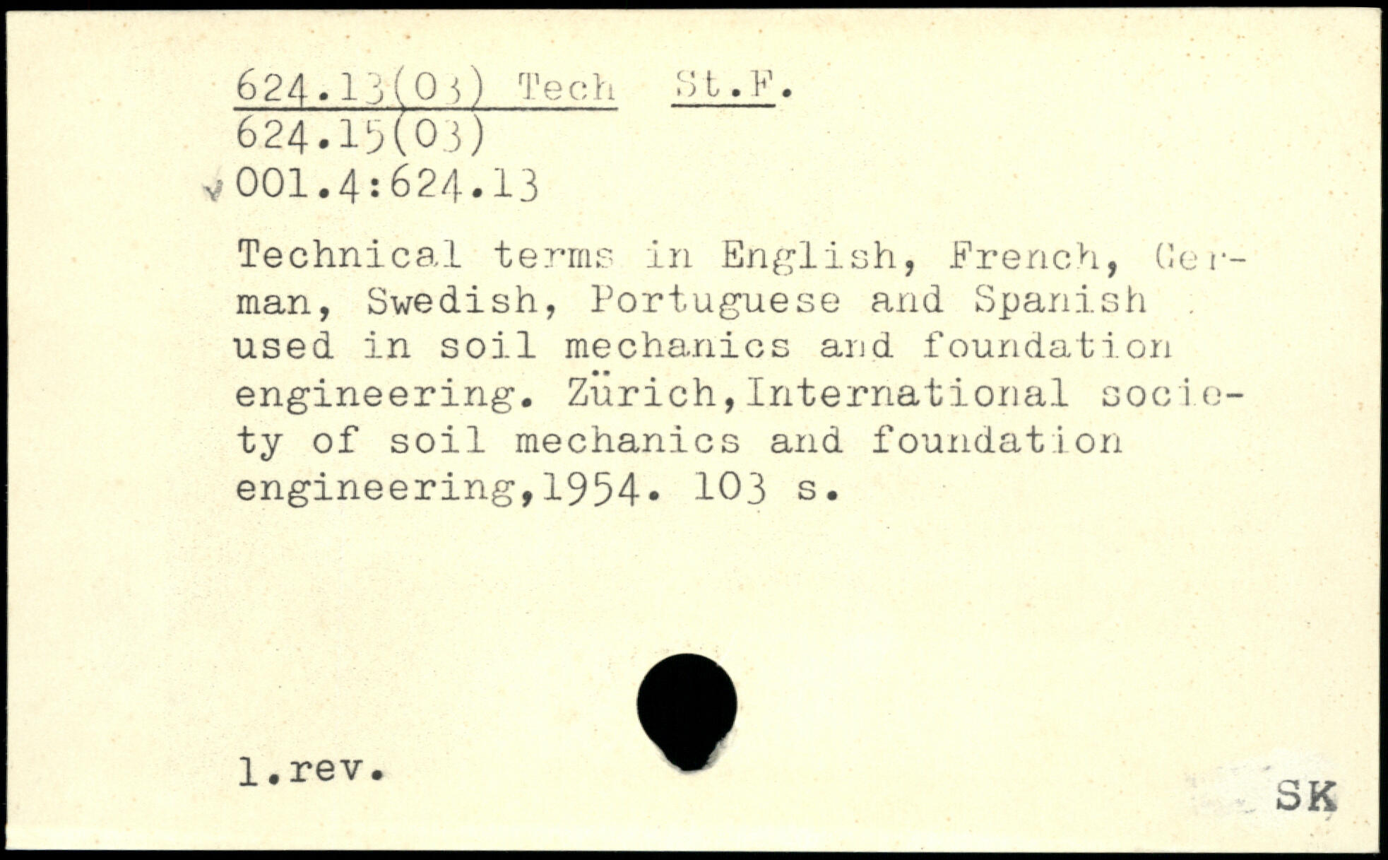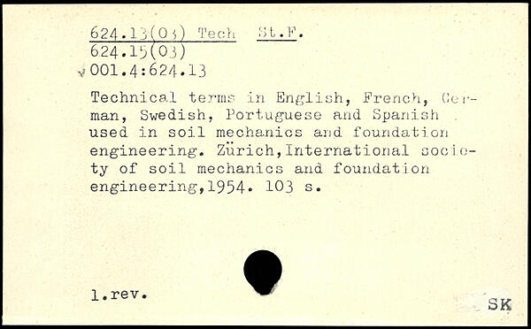 Technical terms in English, French, Herman, Swedish, Portuguese and Spanish used in soil mechanics and foundation engineering. Zurich,International society of soil mechanics and foundation engineering,1954.