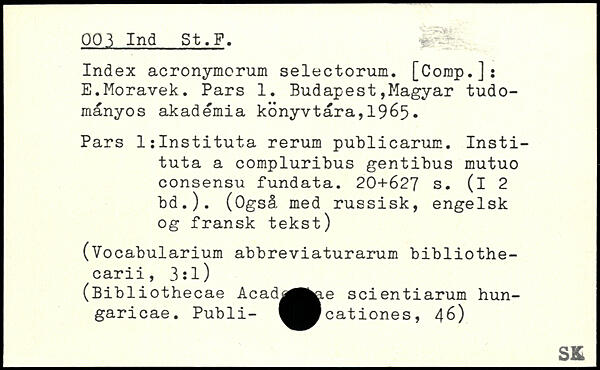 Index acronymcrum selectorum. [Comp.jj E.Moravek. Pars 1. Budapest,Magyar tudo- månyos akadémia konyvtåra,1965. Pars 1:Instituta rerum publicarum. Instituta a compluribus gentibus mutuo consensu fundata.