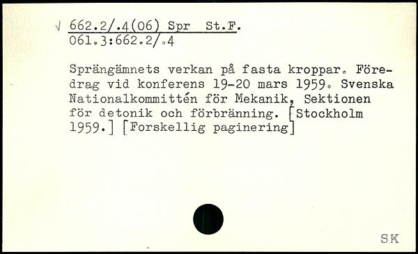 Sprängämnets verkan på fasta kroppar. Foredrag vid konferens 19-20 mårs 1959. Svenska Nationalkommittén för Mekanik, Sektionen för detonik och förbränning.