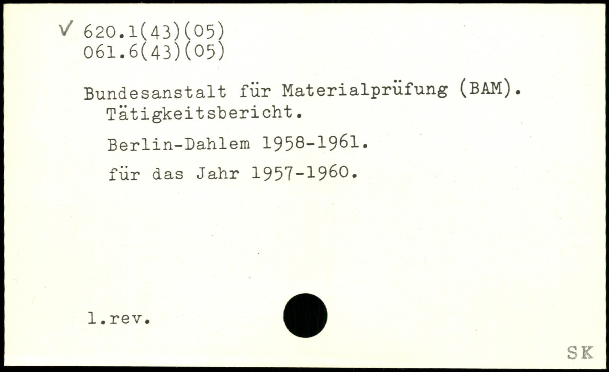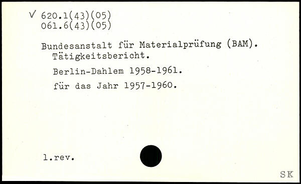 Bundesanstalt für Materialprüfung (BAM). Tätigkeitsbericht. Berlin-Dahlem 1958-1961. für das Jahr 1957-1960.