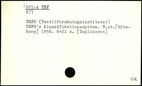 TEFO.s klassifikationssystem. U.st.[Göteborg] 1956.
