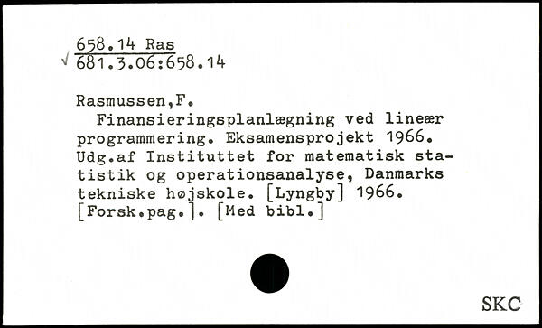 Finansieringsplanlægning ved lineær programmering. Eksamensprojekt 1986. Udg.af Instituttet for matematisk statistik og operationsanalyse, Danmarks tekniske højskole. [Lyngby] 1966.