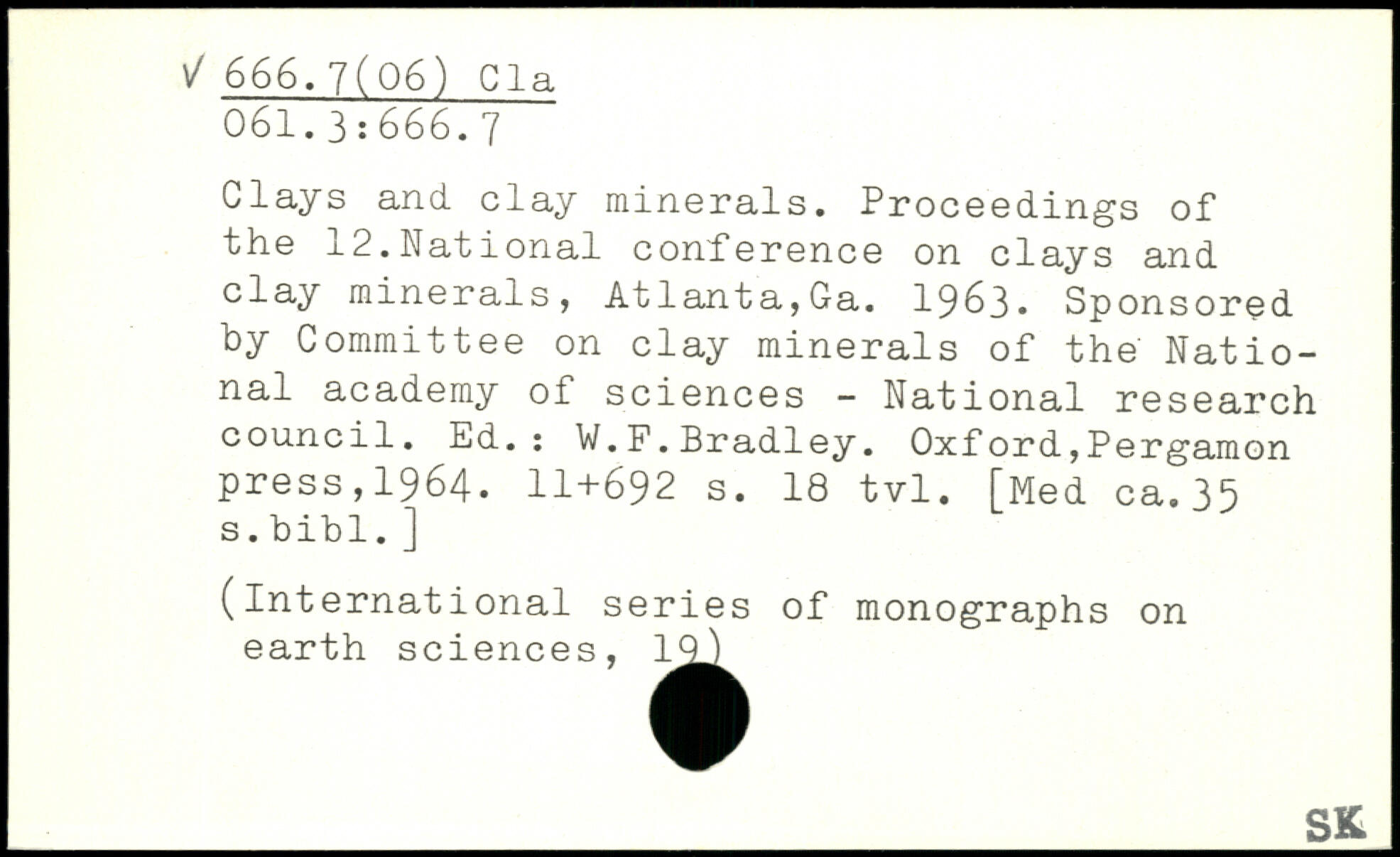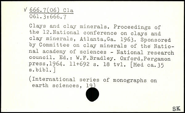 Clays and clay minerals. Proceedings of the 12.National conference on clays and clay minerals, Atlanta,Ga. 1963. Sponsored by Committee on clay minerals of the National academy of sciences - National research council. Ed.: W.F.Bradley.