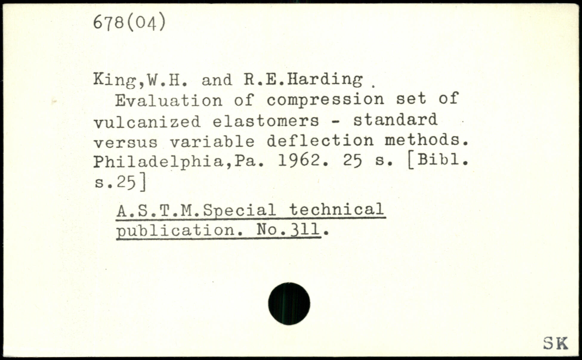 Evaluation of compression set of vulcanized elastomers - standard versus variable deflection methods. Philadelphia,Pa. 1962.