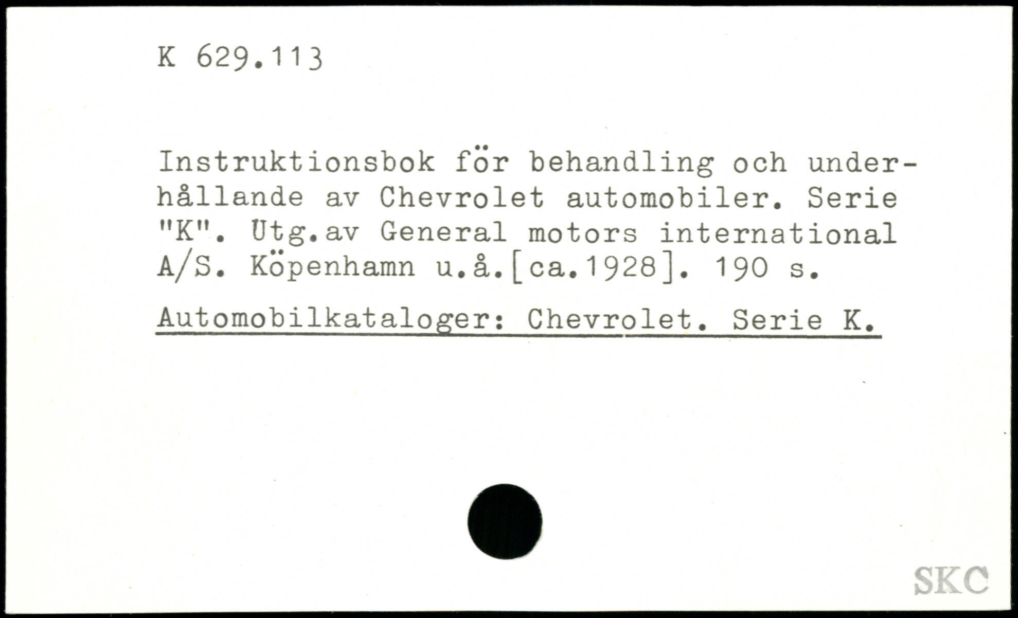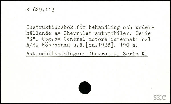 Instruktionsbok för behandling och underhållande av Chevrolet automobiler. Serie "K". Utg.av General motors International A/S. Köpenhamn u.å.[ca.1928].