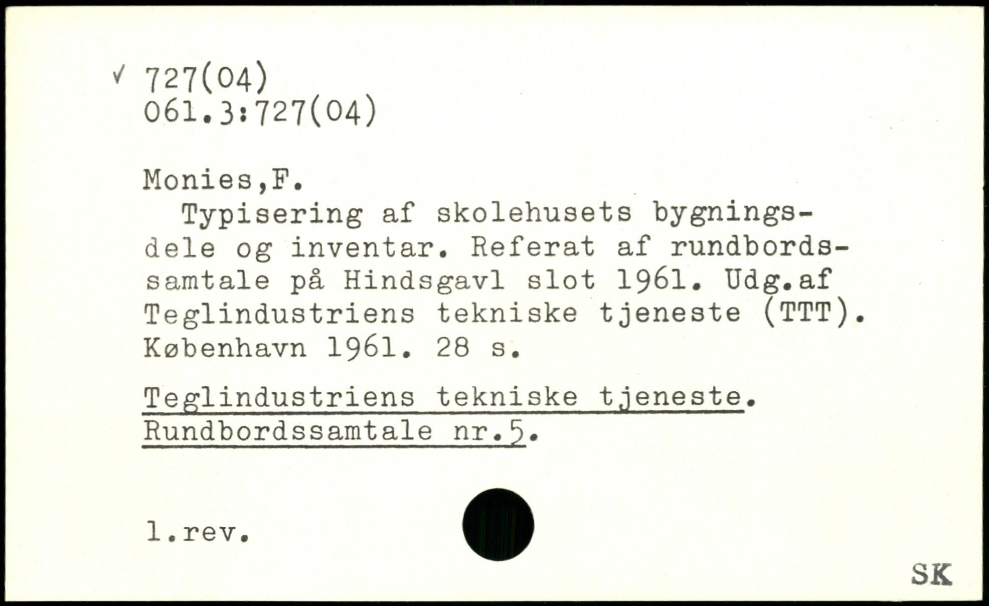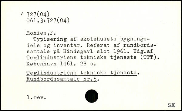 Typisering af skolehusets bygningsdele og inventar. Referat af rundbordssamtale på Hindsgavl slot 1961. Udg.af Teglindustriens tekniske tjeneste (TTT).