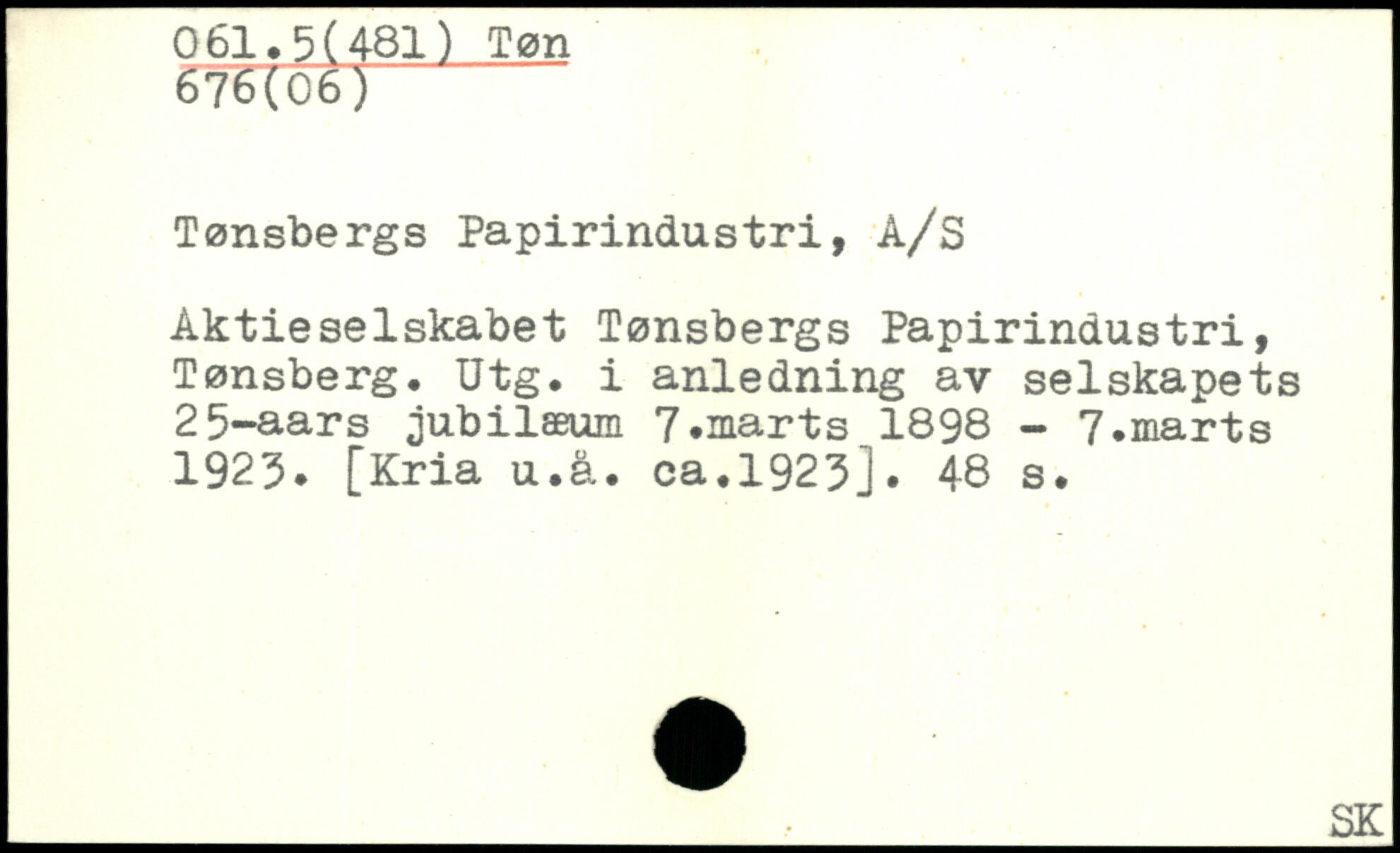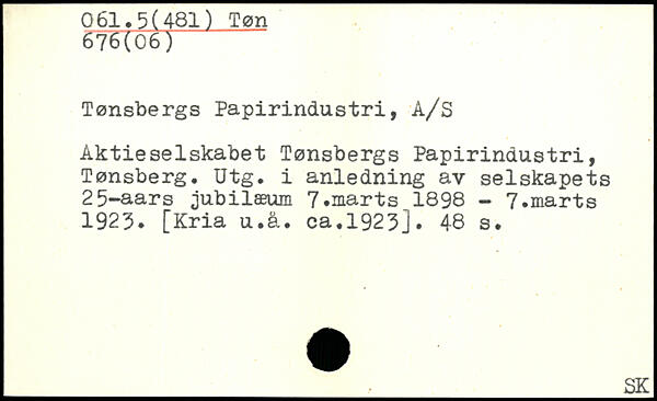 Tønsbergs Papirindustri, A/S Aktieselskabet Tønsbergs Papirindustri, Tønsberg. Utg. i anledning av selskapets 25-aars jubilæum 7,marts_1898 - 7.marts 1925. [Kria u.å. ca.1923j.