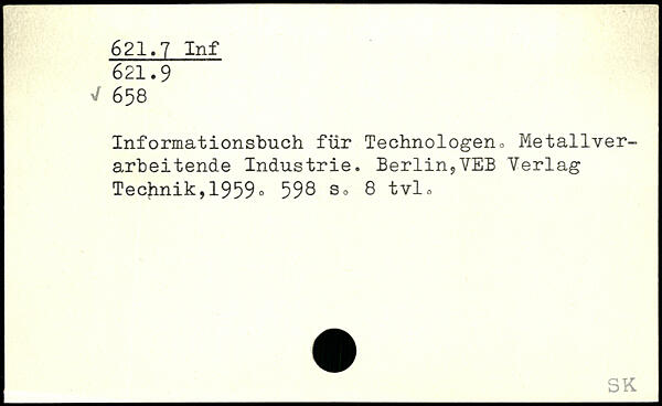 Informationsbuch für Technologeno Metallverarbeitende Industrie. BerlinsVEB Verlag Technik,1959