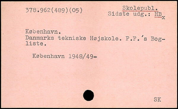 Sidste udg.: HB —x København. Danmarks tekniske Højskole. P.F.'s Bogliste.