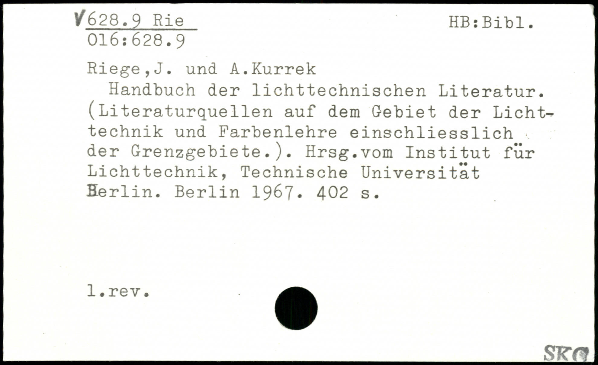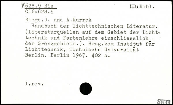 Handbuch der lichttechnischen Literatur. (Literaturquellen auf dem Gebiet der Lichttechnik und Farbenlehre einschliesslich der Grenzgebiete.). Hrsg.vom Institut für Lichttechnik, Technische Universität Berlin.