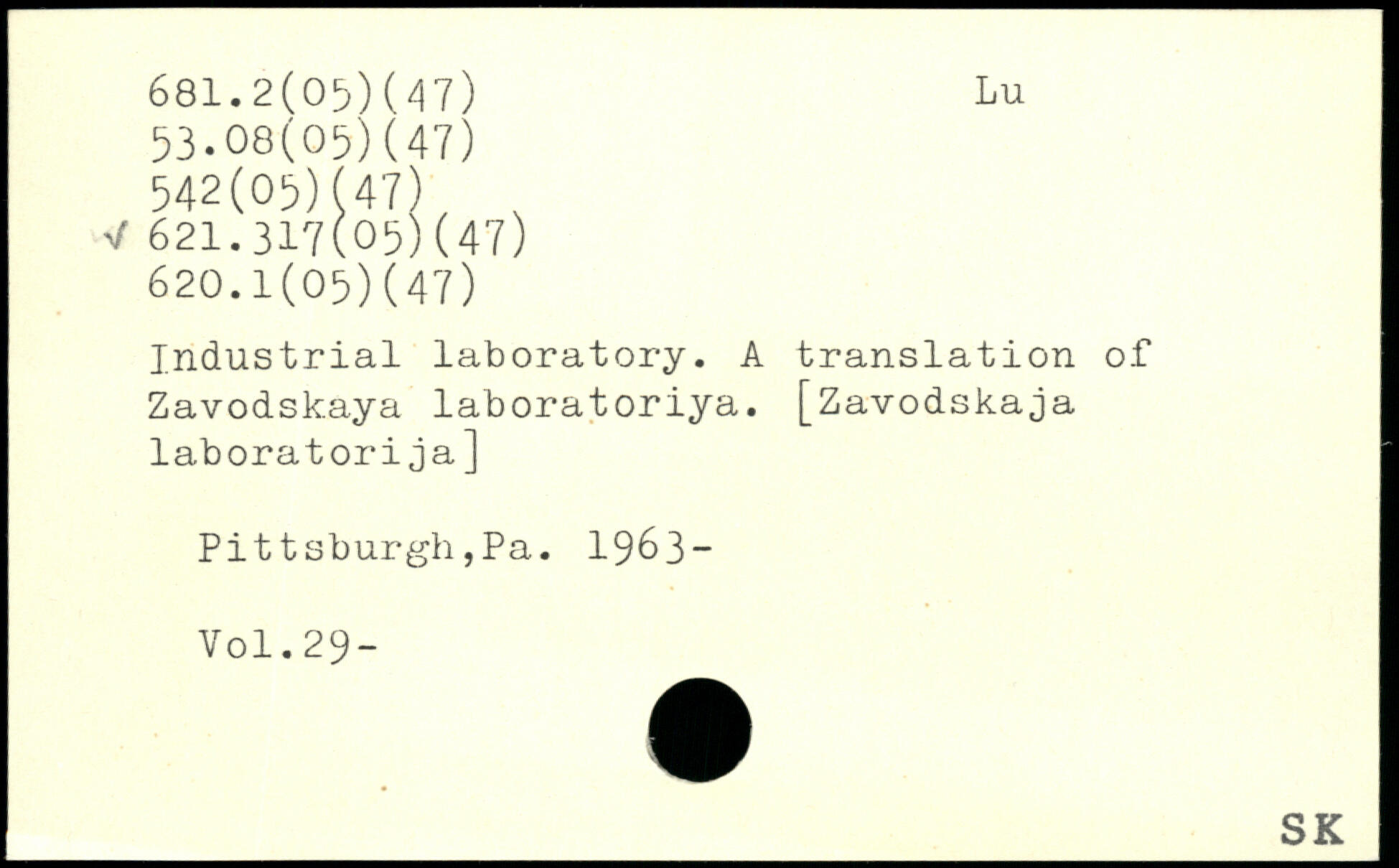 Industrial laboratory. A translation of Zavodskaya laboratoriya.