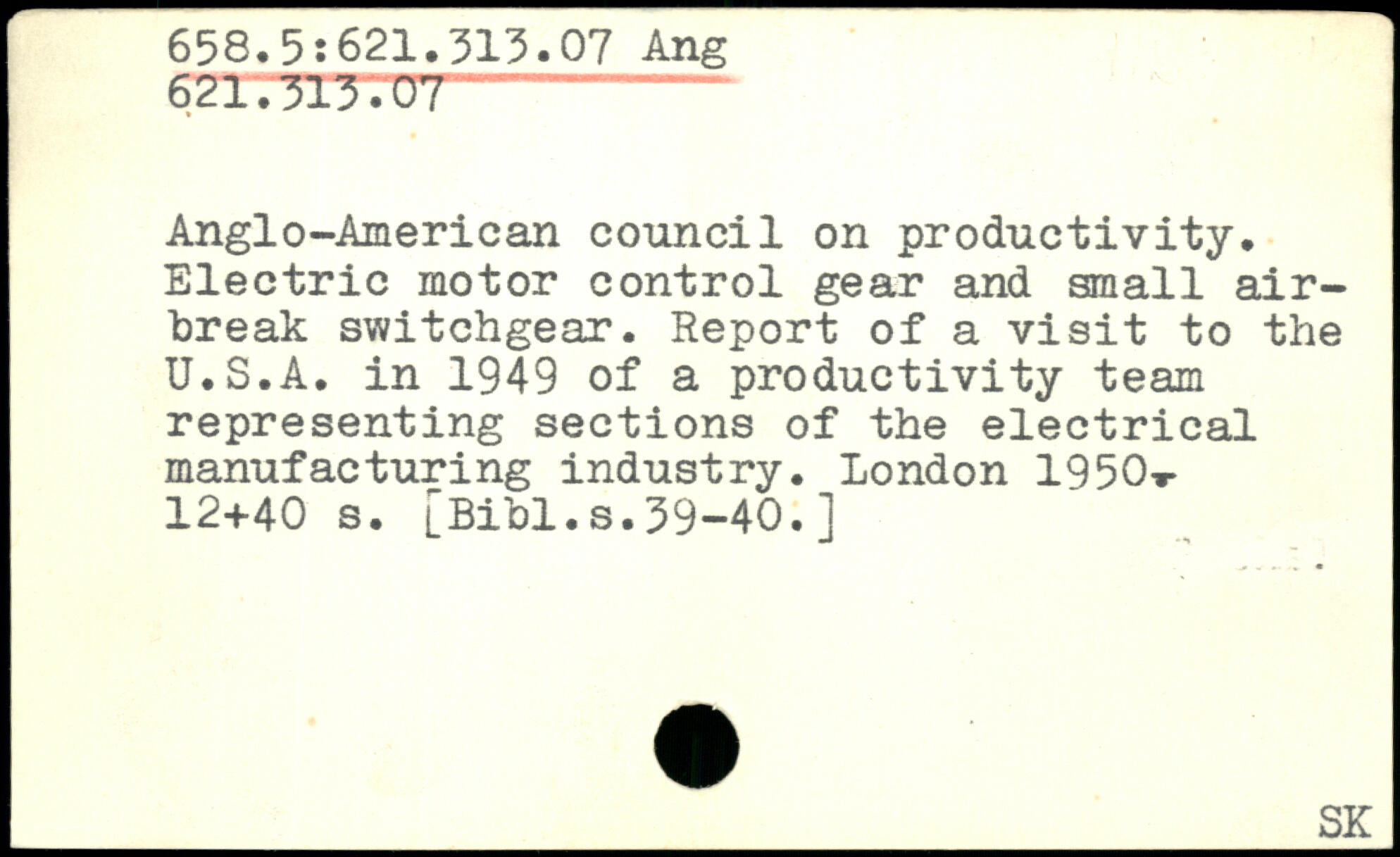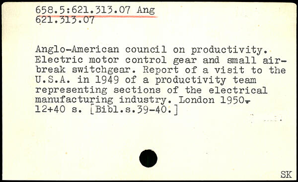 Anglo-American council on productivity. Electric motor control gear and small air-break switchgear. Report of a visit to the U.S.A. in 1949 of a productivity team representing sections of the electrical manufacturing industry.