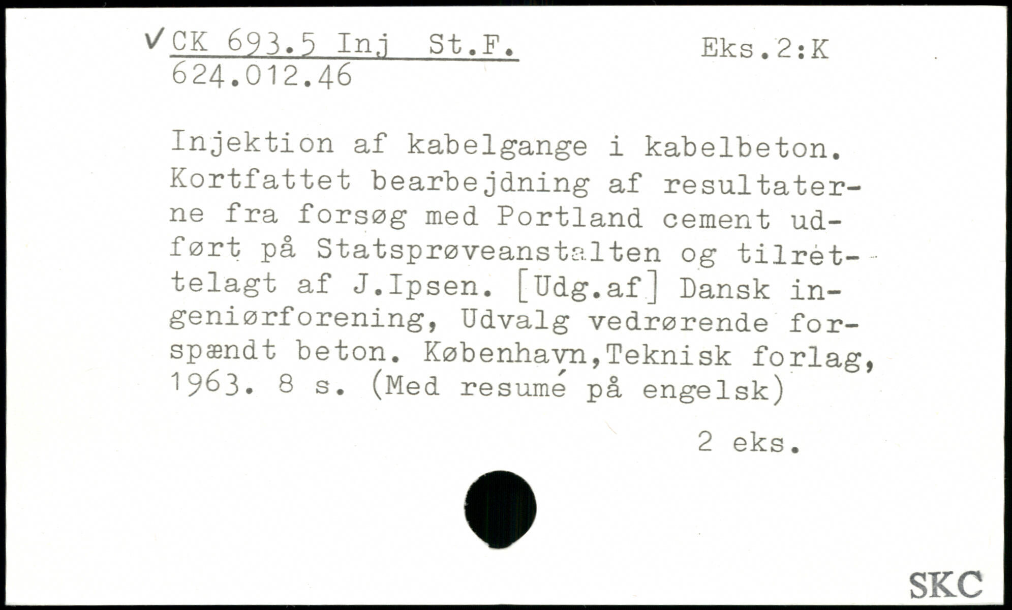 Injektion af kabelgange i kabelbeton. Kortfattet bearbejdning af resultaterne fra forsøg med Portland cement udført på Statsprøveanstalten og tilret--telagt af J.Ipsen. [Udg.af] Dansk ingeniørf orening, Udvalg vedrørende forspændt beton.