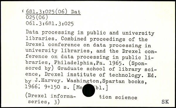 Data processing in public and university libraries. Combined proceedings of the Drexel conference on data processing in university libraries, and the Drexel conference on data processing in public libraries, Philadelphia,Pa. 1965. (Sponsored by) Graduate school of library science, Drexel institute of technology. Ed. by J.Harvey.