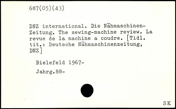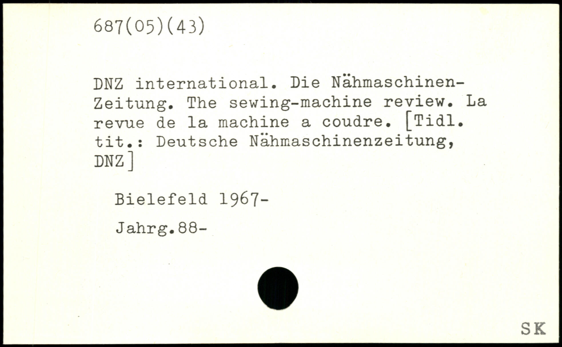 DNZ international. Die Nahmaschinen-Zeitung. The sewing-machine review. La revue de la machine a coudre. [Tidl. tit.: Deutsche Nahmaschinenzeitung, DNZ ] Bielefeld 1967-Jahrg.88-