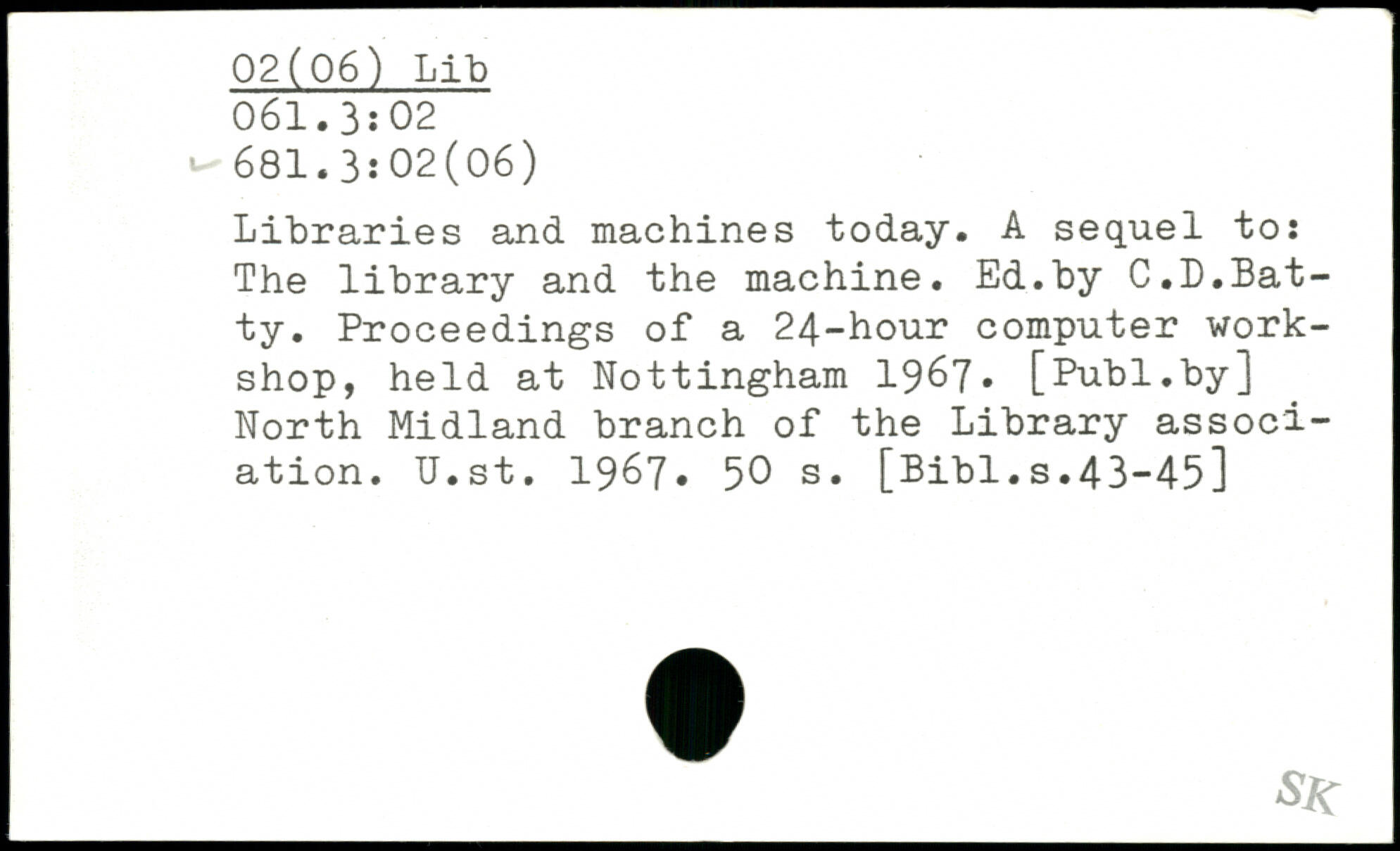 Libraries and machines today. A sequel to: The library and the machine. Ed.by C.D,Batty. Proceedings of a 24-hour computer workshop, held at Nottingham 1967
