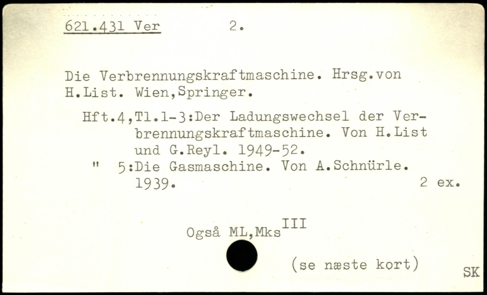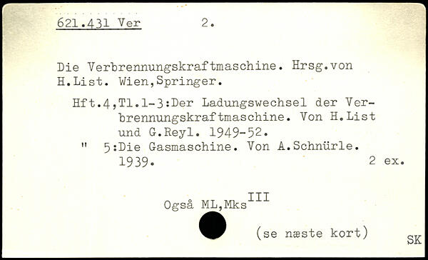 Die Verbrennungskraftmaschine. Hrsg.von H.List. Wien,Springer. Hft.4,T1.1-3:Der Ladungswech.se 1 der Ver-brennungskraftmaschine. Von H.List und G.Reyl. 1949-52. " 5:Lie Gasmaschine. Von A.Schniirle. 1939. 2 ex. Også MLjMks111