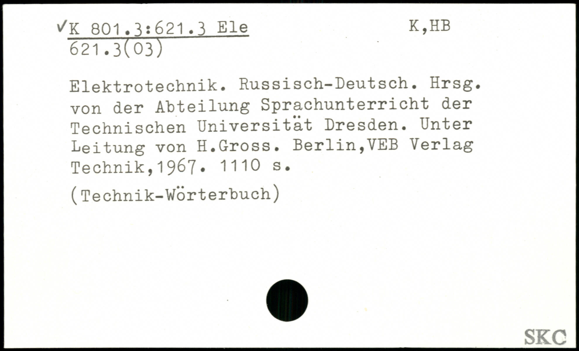 Elektrotechnik. Russisch-Deutsch. Hrsg, von der Abteilung Sprachunterricht der Technischen Universität Dresden. Unter Leitung von H.Gross. Berlin,VEB Verlag Technik,19^7.