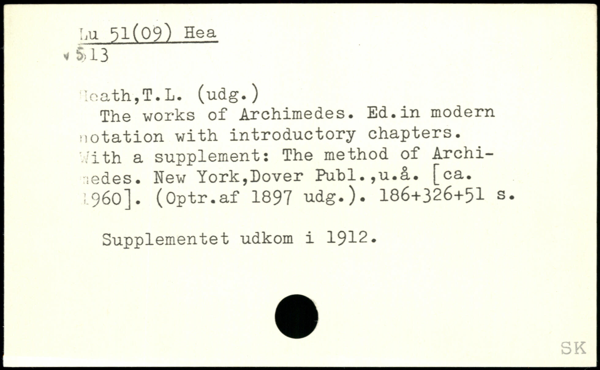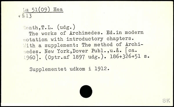 ;oath,T.L. (udg.) The works of Archimedes. Ed.in modern notation with introductory chapters. With a supplement: The method of Archi-rtedes. New York,Dover Publ.,u.&. [ca. 1960]. (Optr.af