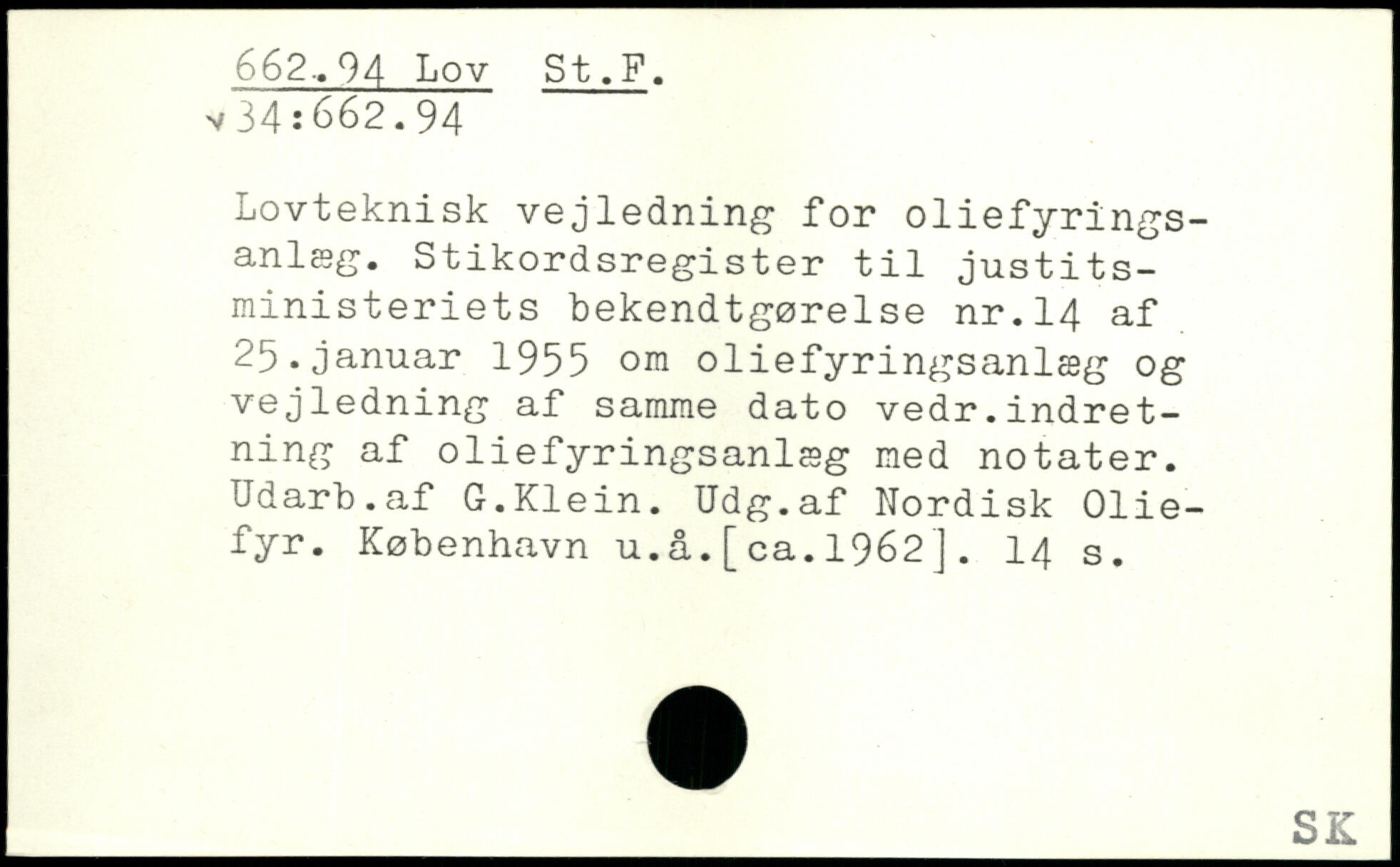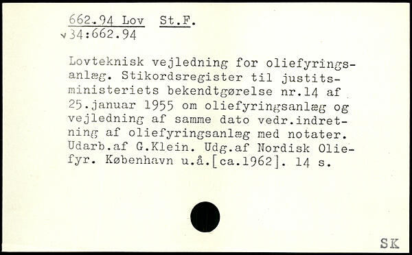 Lovteknisk vejledning for oliefyringsanlæg. Stikordsregister til justitsministeriets bekendtgørelse nr.14 af 25.januar 1955 om oliefyringsanlæg og vejledning af samme dato vedr.indretning af oliefyringsanlæg med notater. Udarb.af G.Klein. Udg.af Nordisk Oliefyr. København u.å.[ca.1962].