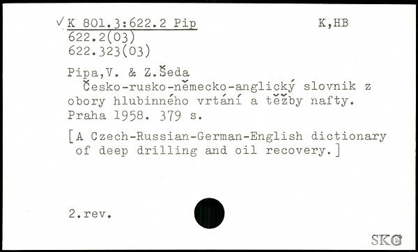 Cesko-rusko-nemecko-anglicky slovnik z obory hlubinneho vrtani a tezby nafty.